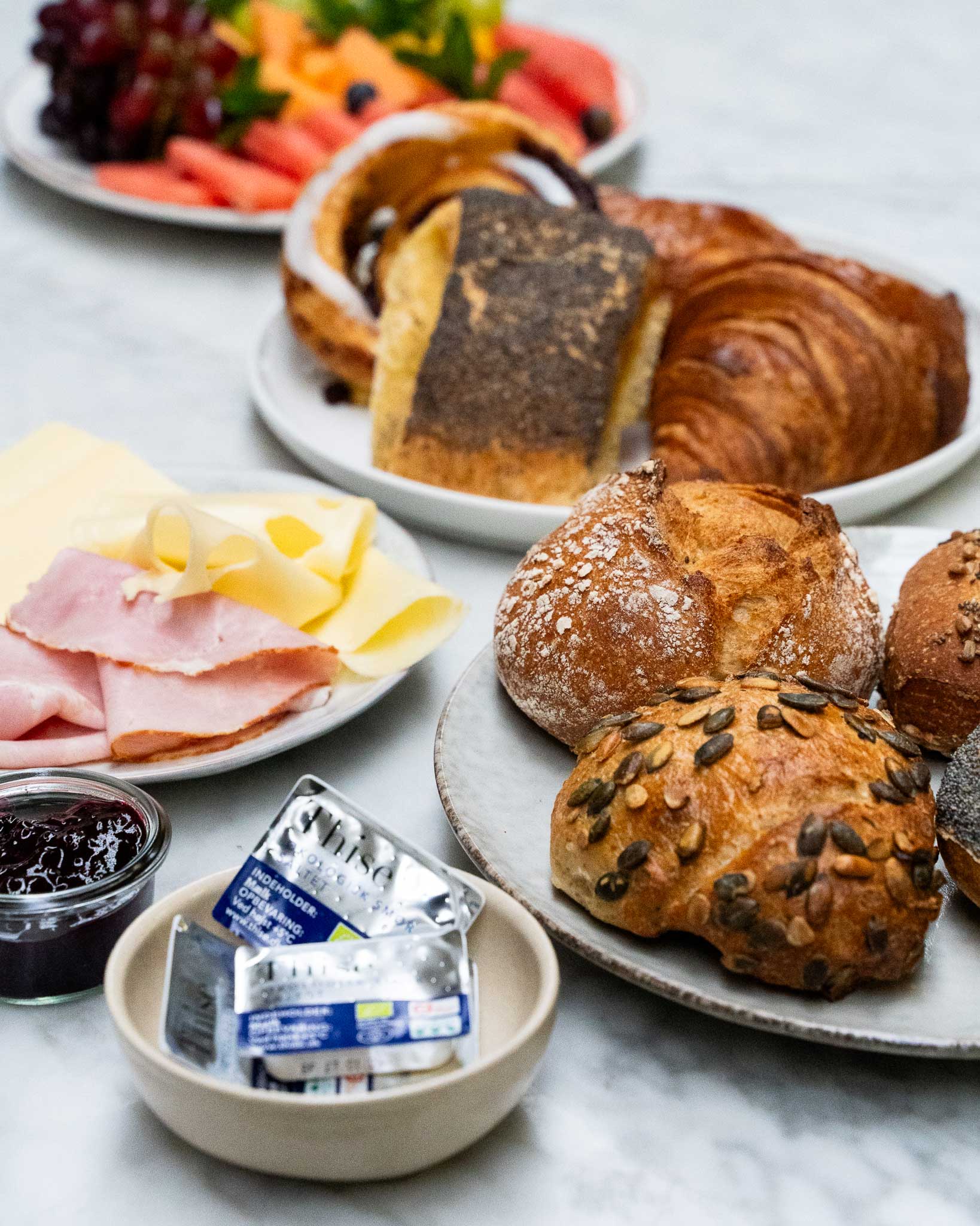- Morgenmad med friskbagte fristelser, pålæg og frugt