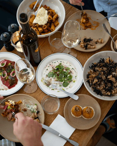 Vælg 8 eller 12 deleretters family style menu – eller gå all-in med bobler, vinmenu, limoncello og en aften uden bagkant.